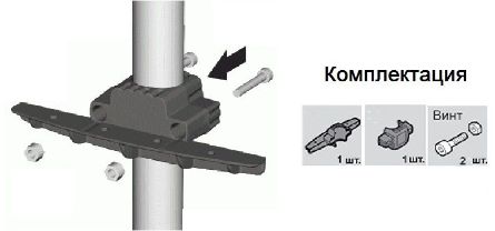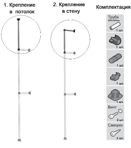 Стойка предусматривает 3 точечных крепления: два крепления к стене и одно — к полу. Фиксация пятки к полу возможна без засверливания — через специальный стыковочный элемент в комплекте и двусторонний скотч.