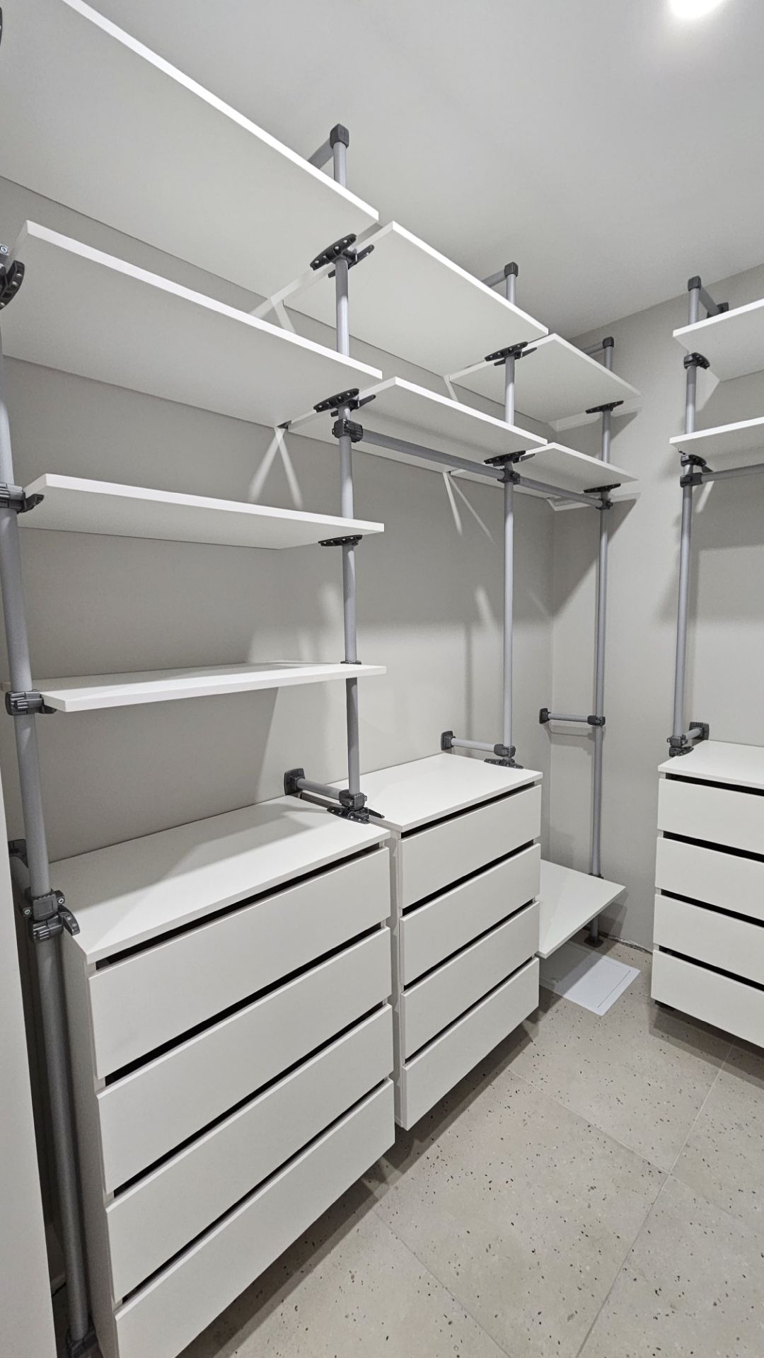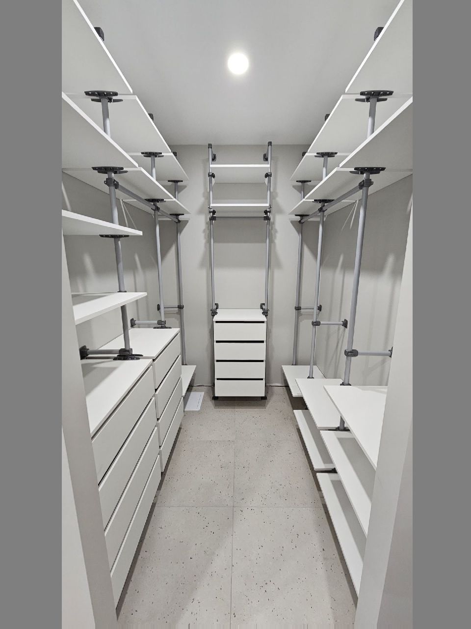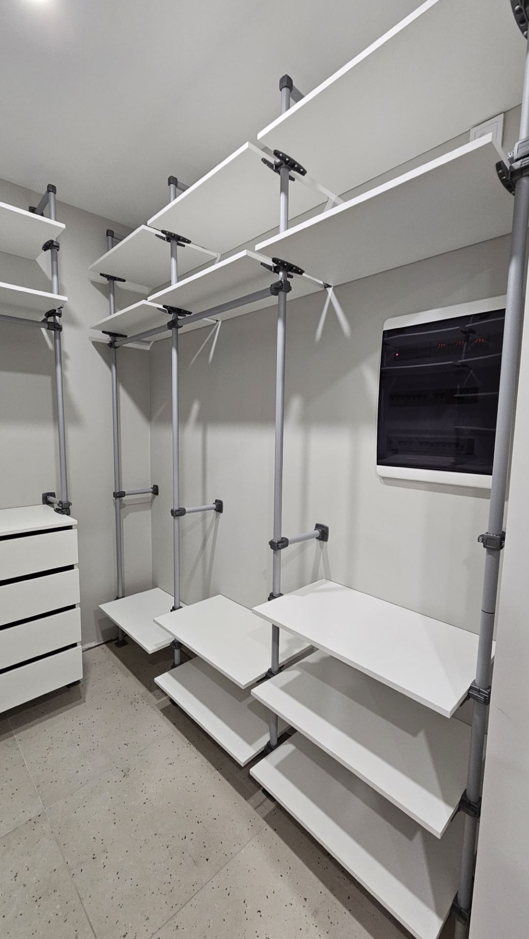 Гардеробная в отдельном помещении. Высота потолков 2700, система хранения до потолка с креплением в стену, так как потолки натяжные.
