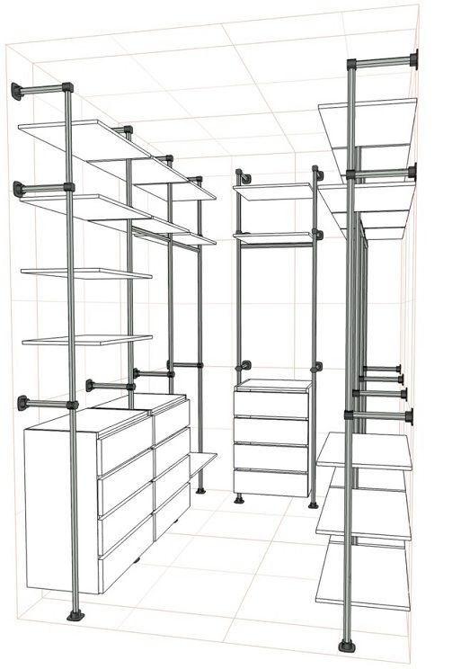 По задней стене гардеробной расположен пролет с ящиками, штангой под короткую одежду и антресольными полками.