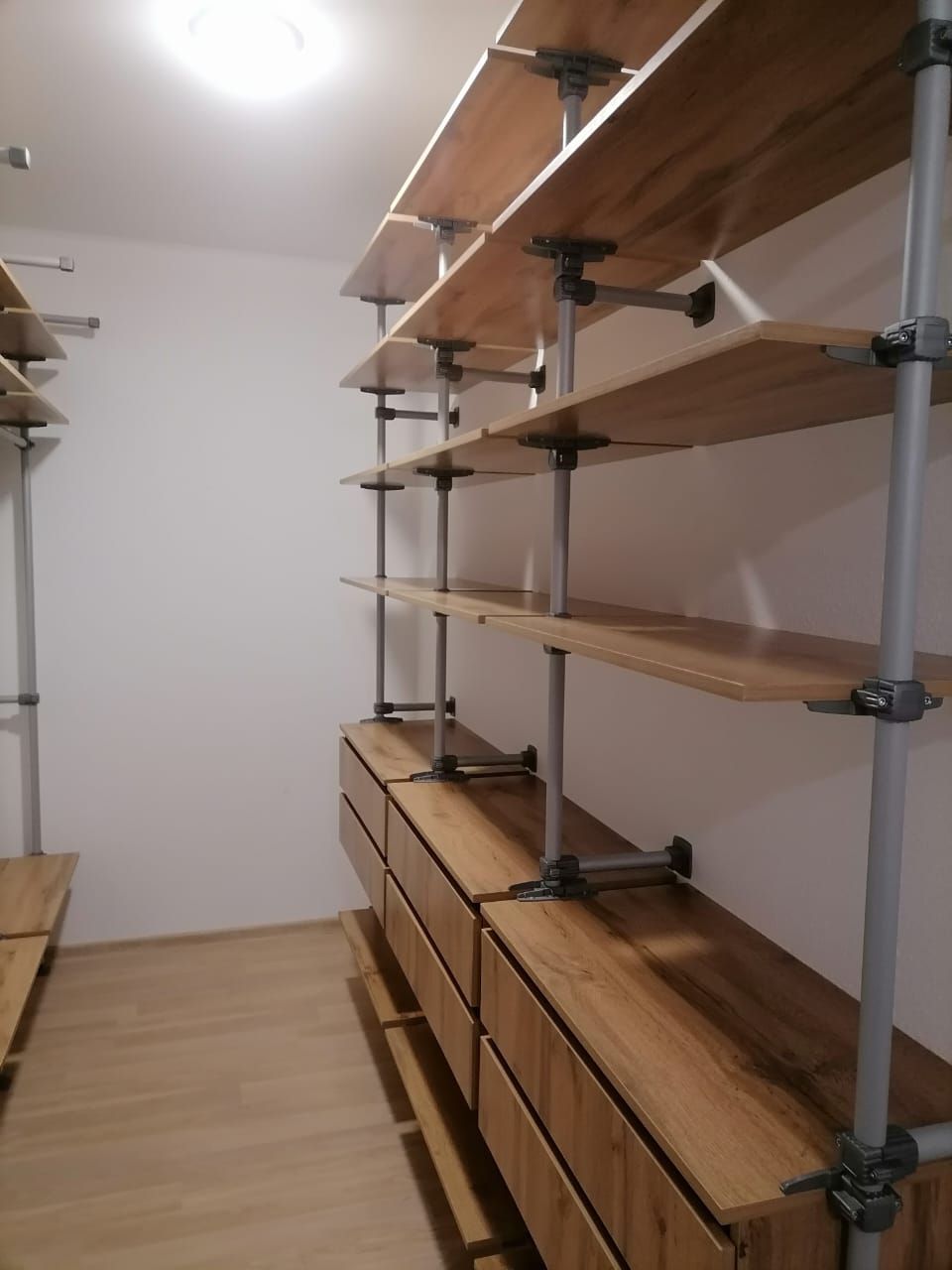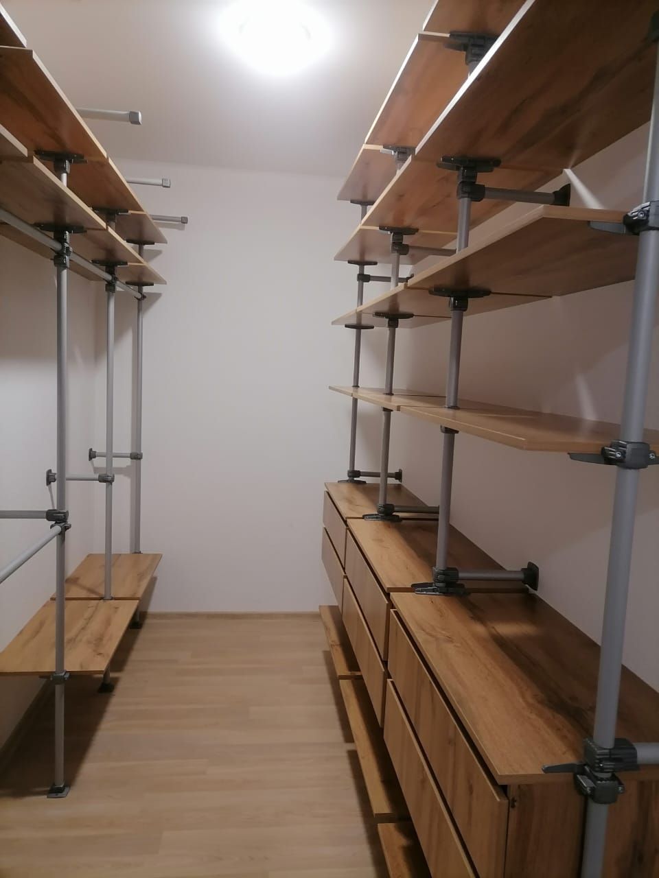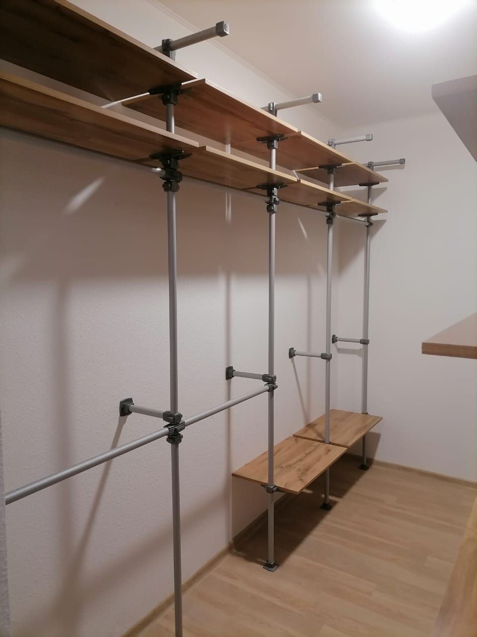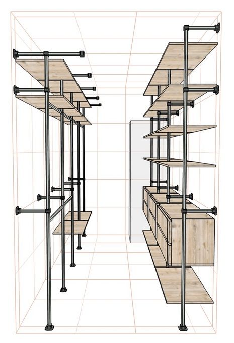 По стене слева первые два пролета со штангами в два яруса для короткой/детской одежды и полками сверху, третий и четвертый пролеты со штангами под длинную одежду и полками сверху. На самом верху силовые кронштейны под спортивное оборудование.