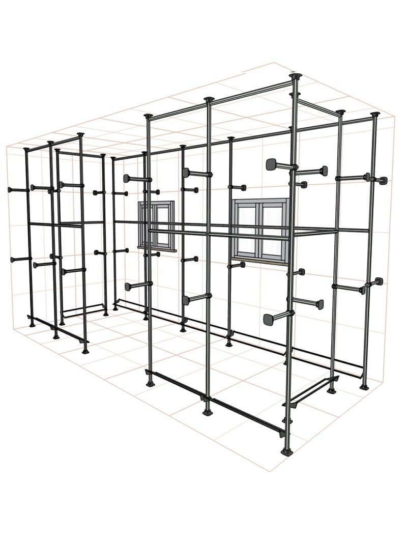 По периметру гардеробной пролеты со штангами под длинную одежду в 2 яруса и обувницами снизу. Без полок.
