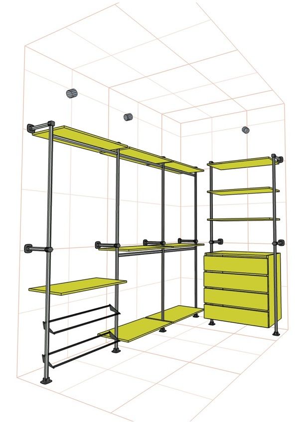 По задней стене гардеробной расположен пролет с ящиками и полками.