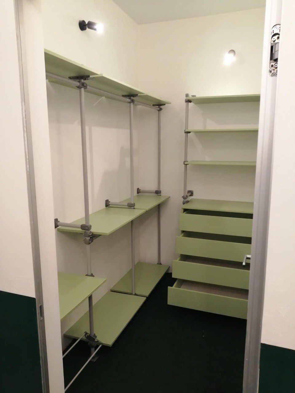 По задней стене гардеробной расположен пролет с ящиками и полками.