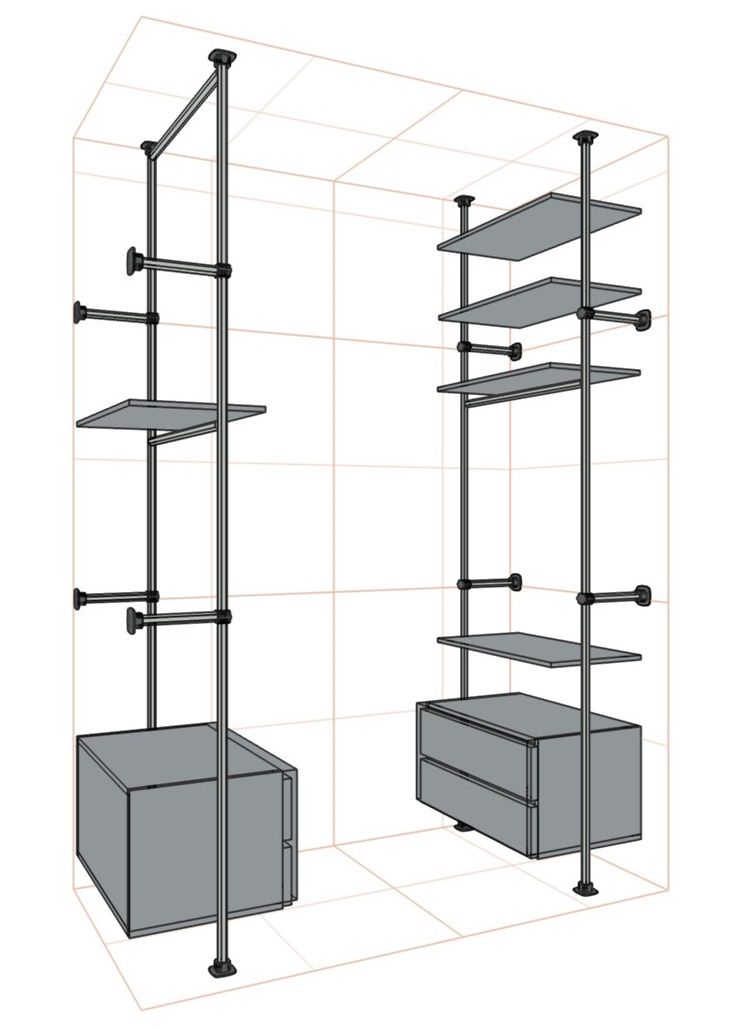 Слева пролет со штангами в 2 яруса под длинную одежду, полкой и ящиками снизу.