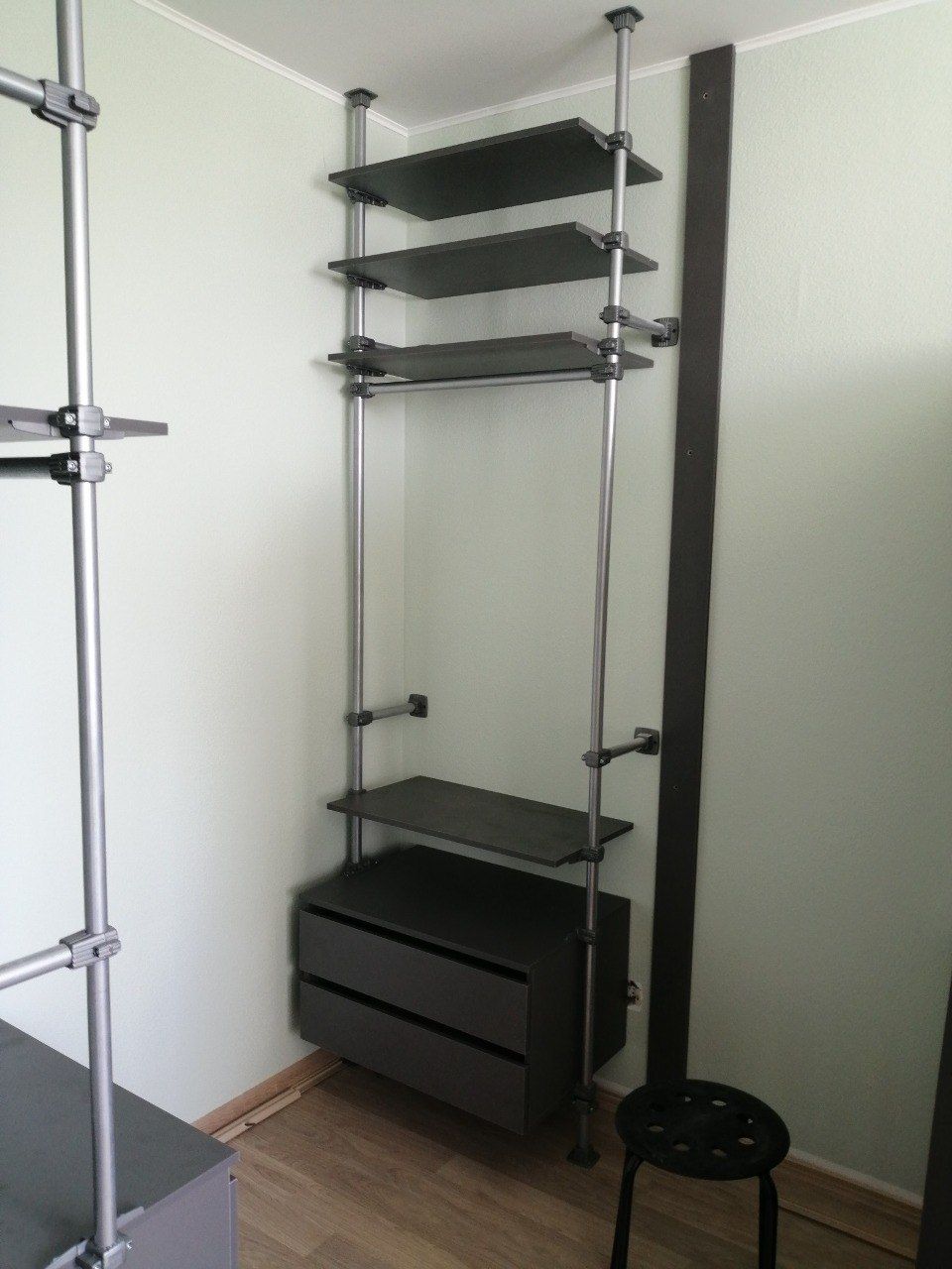 Слева пролет со штангами в 2 яруса под длинную одежду, полкой и ящиками снизу.