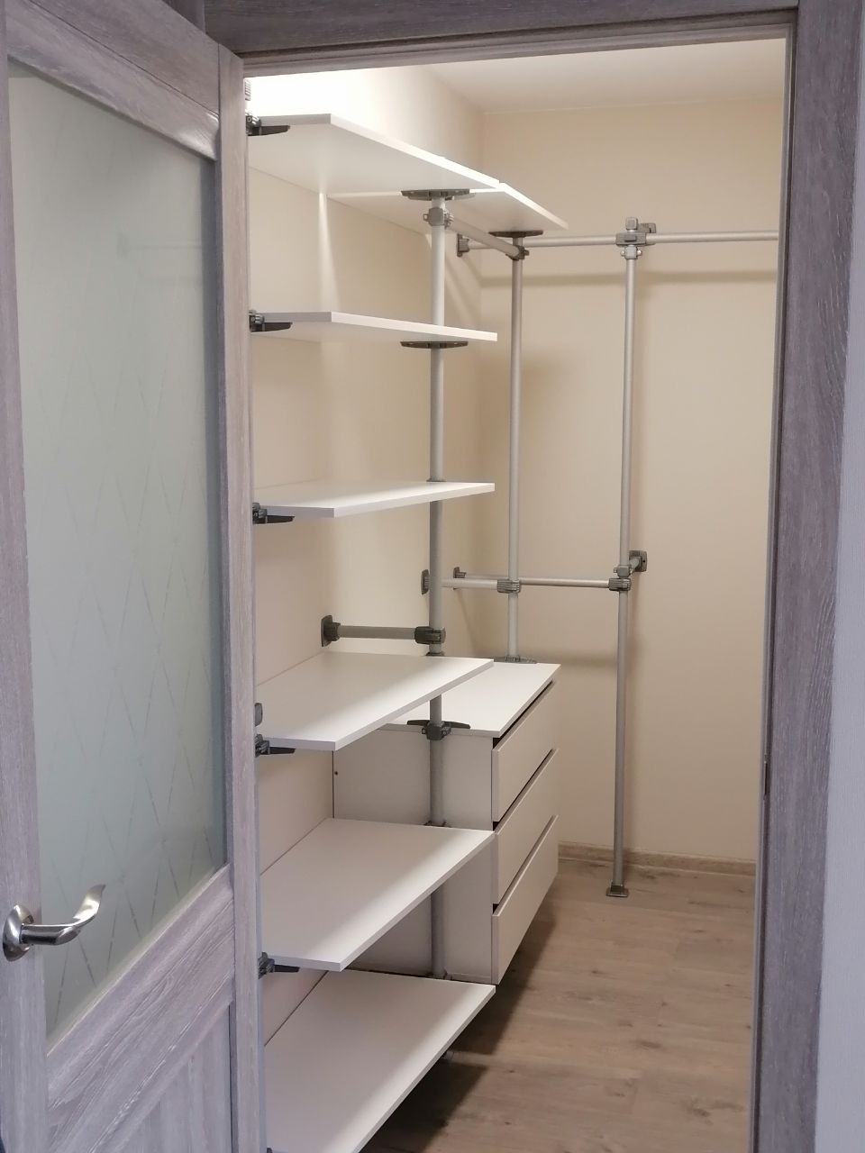 Гардеробная в отдельном помещении узком и глубоком. Потолки 2450мм. Система хранения высотой 2м.
