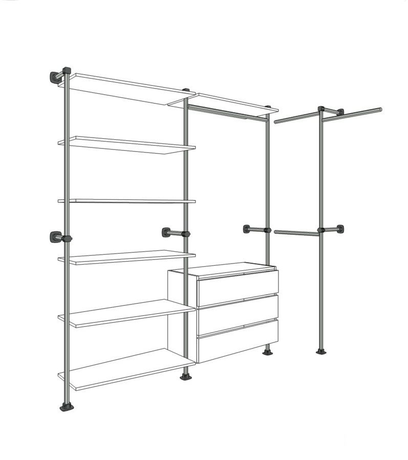 Первый пролет слева полки трапецией, второй пролет-ящики, полка и резервная штанга под одежду.